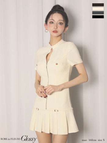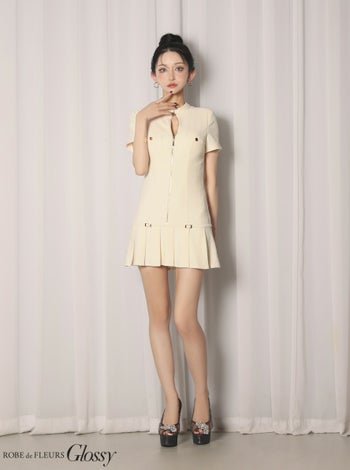 キャバドレス Glossy ROBE de FLEURS グロッシー ローブドフルール ワンカラー セクシー ベルトデザイン プリーツ 半袖 ジップデザイン フレアミニドレス