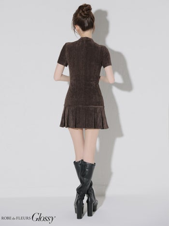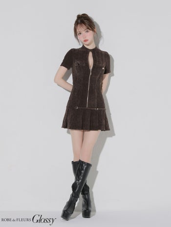 XSあり!暖かみのある一着♪ 【Glossy by ROBE de FLEURS/グロッシー】ワンカラー セクシー ベルトデザイン プリーツ 半袖 ジップデザイン フレアミニドレス (GL3964)