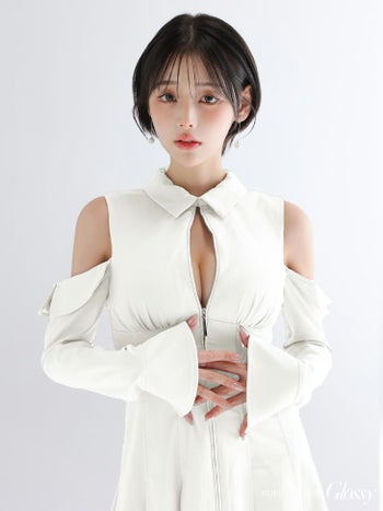 3. 【Glossy by ROBE de FLEURS/グロッシー】ジップデザイン 長袖 襟付き プリーツスカート 肩あき フレアミニドレス (GL4126)