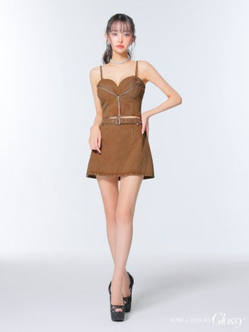 3. 【Glossy by ROBE de FLEURS/グロッシー】デニム キャミソール ジップデザイン ハートカット セットアップ ウエストベルト タイトミニドレス (GL4142)