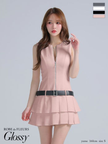 3. 【Glossy by ROBE de FLEURS/グロッシー】ウエストベルト プリーツ ノースリーブ ジップデザイン シンプル フレアミニドレス (GL4307)