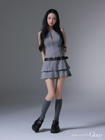 4. 【Glossy by ROBE de FLEURS/グロッシー】ウエストベルト プリーツ ノースリーブ ジップデザイン シンプル フレアミニドレス (GL4307)