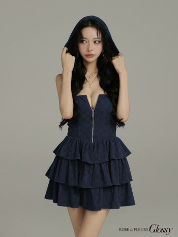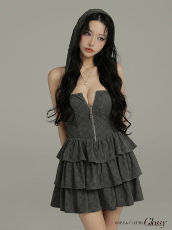 3. 【Glossy by ROBE de FLEURS/グロッシー】ベアトップ ノースリーブ 2way フーディー ティアード ジップデザイン チェック柄 フレアミニドレス (GL4621)