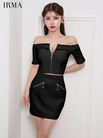 キャバドレス IRMA イルマ オフショルダー セットアップ 袖あり ジップデザイン ビジュー タイトミニドレス