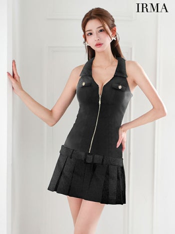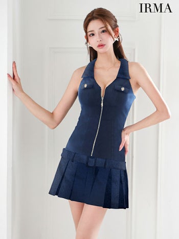 キャバドレス IRMA イルマ ローウエストベルト プリーツ 襟付き ストライプ デニム ジップデザイン ノースリーブ フレアミニドレス