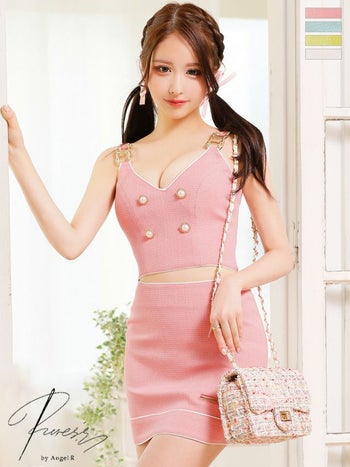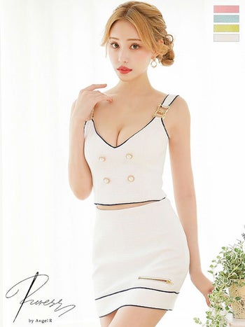 XSあり!トップのバストパールボタンがキュート☆ SALE【PURESS/ピュアレス】バストパールボタン ノースリーブ ツイード ジップデザイン ショルダーバックル セットアップ タイトミニドレス (PS302405)
