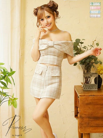 キャバドレス ブランドドレス PURESS ピュアレス セットアップ チェック ツイード オフショルダー リボン パール フレアミニドレス