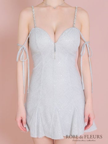 キャバドレス ROBEdeFLEURS ガーリー ジップデザイン リボン ラメニット スパンコール キャミソール フレアミニドレス