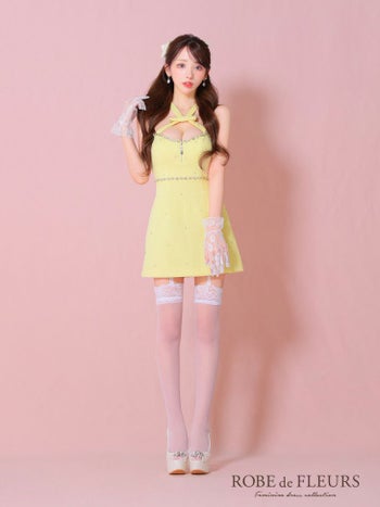 4. 【ROBEdeFLEURS/ローブドフルール】オープンバスト ジップデザイン ホルターネック リボン ビジュー ガーリー フレアミニドレス (fm3442)