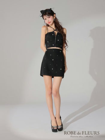 XSあり!ガーリーなデザイン♪ 【ROBEdeFLEURS/ローブドフルール】ジップデザイン キャミソール ホルターネック リボン ハートビジュー セットアップ ガーリー オープンバスト フレアミニドレス (fm3586)