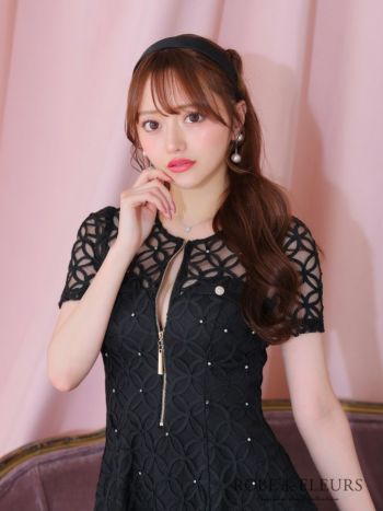 キャバドレス ROBEdeFLEURS ローブドフルール ジップデザイン 半袖 レース シースルー ビジュー ガーリー フレアミニドレス
