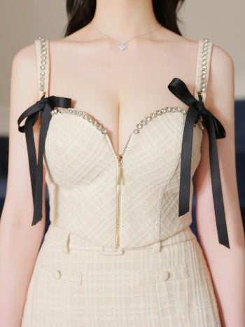 3. 【ROBEdeFLEURS/ローブドフルール】オープンバスト スエードリボン ベルトデザイン チェック柄 ツイード ビジュー ジップデザイン キャミソール セットアップ ガーリー フレアミニドレス (fm3734)