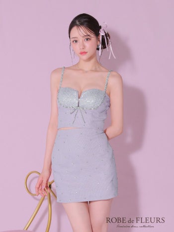 4. 【ROBEdeFLEURS/ローブドフルール】ビーズ付き スパンコール チュール ジップデザイン ビジュー キャミソール サマーツイード セットアップ フロントリボン フレアミニドレス(fm3738)