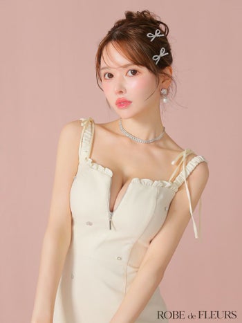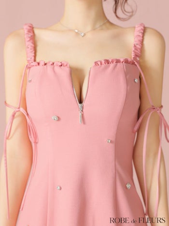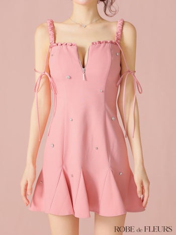 キャバドレス ROBEdeFLEURS ローブドフルール  ノースリーブ ジップデザイン ガーリー ショルダーリボン ビジュー フレアミニドレス