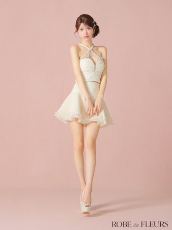 キャバドレス ROBEdeFLEURS ローブドフルール ジップデザイン セットアップ ビジュー ホルターネック シフォン ラメ フレアミニドレス