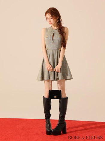 4. 【ROBEdeFLEURS/ローブドフルール】ノースリーブ ジップデザイン ツイード フェミニン ゴールドボタン フレアミニドレス (fm4128)