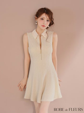 4. 予約商品【2月中旬入荷予定】【ROBEdeFLEURS/ローブドフルール】ジップデザイン シンプル 襟付き ノースリーブ ラメ フレアミニドレス (fm4212)