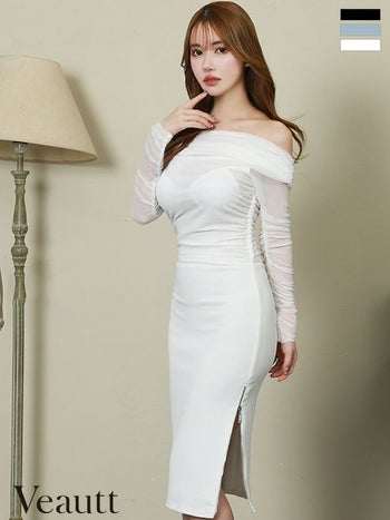 キャバドレス 高級 Veautt ヴュート サイドジップ 長袖 シアー ワンカラー オフショルダー タイトひざ丈ドレス