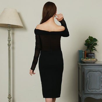 オフショルダー ワンカラー サイドジップ シースルー 長袖 タイトひざ丈ドレスのイメージ画像3