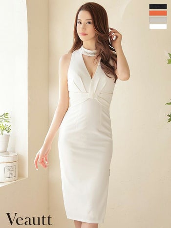 4. 【Veautt/ヴュート】オープンバストタック ネックビジュー チェーン ホルターネック ジップデザイン スリット タイト ひざ丈ドレス(VT022405)
