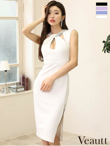 3. SALE【Veautt/ヴュート】ジップデザイン デコルテビジュー ノースリーブ セクシー オープンバスト 膝丈ドレス (VT022409)