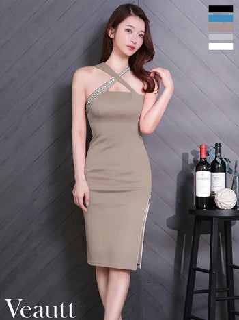 キャバドレス Veautt ヴュート アシンメトリー ビジュー ジップデザイン セクシー ホルターネック クロスデザイン 膝丈ドレス