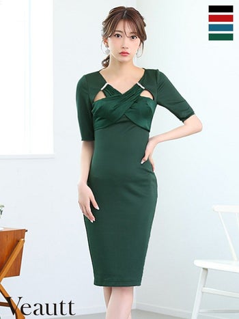 キャバドレス Veautt アッパークロス ビジュー サテンスリーブ ジップデザイン 袖あり セクシー 膝丈ドレス