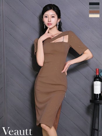 キャバドレス Veautt ヴュート アシメデザイン 袖あり ワンショルダー ラメ ジップデザイン チェーン スリット タイト 膝丈ドレス