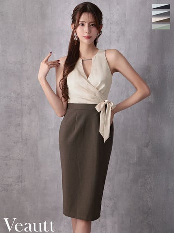 キャバドレス Veautt ヴュート チェーン ウエストクロス リボン ジップデザイン バイカラー ノースリーブ バストタック 膝丈ドレス