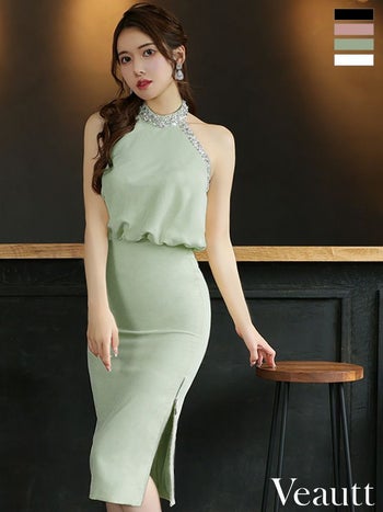 XSあり!Veauttならではの贅沢な仕上がり♪ 【Veautt/ヴュート】エレガント セクシー ジップスリット ラインビジュー ホルターネック オープンバック タイトひざ丈ドレス(VT04222)