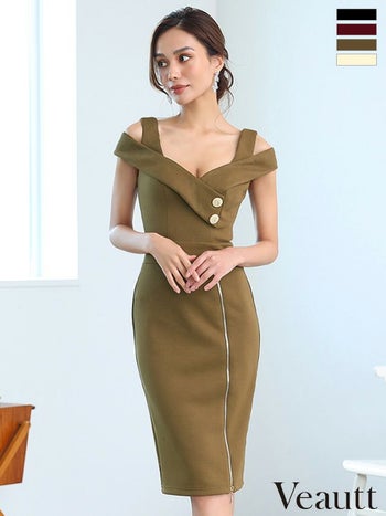 キャバドレス Veautt ウエストマーク ボタン 肩あき ジップデザイン セクシー 膝丈ドレス
