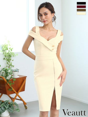 キャバドレス Veautt 肩あき ジップデザイン セクシー ウエストマーク ボタン 膝丈ドレス