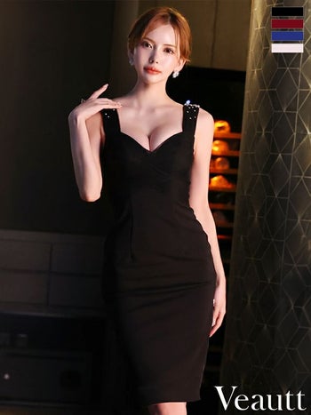 XSあり!上品なオーラを放つ一着♪ 【Veautt/ヴュート】オープンバスト ノースリーブ ジップデザイン ショルダービジュー メッシュ セクシー 膝丈ドレス (VT082413)