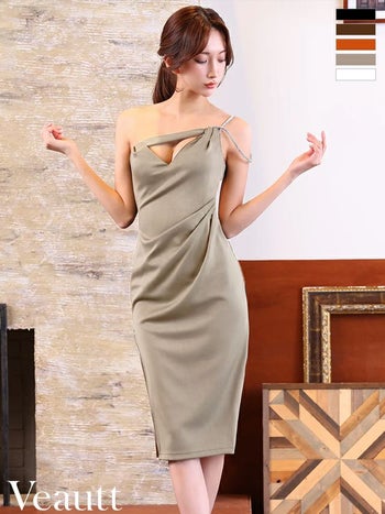 XSあり!シンプル&セクシーな一着☆ 【Veautt/ヴュート】ウエストタック バストカット ジップデザイン ワンショルダー セクシー ビジュー 膝丈ドレス (VT082504)