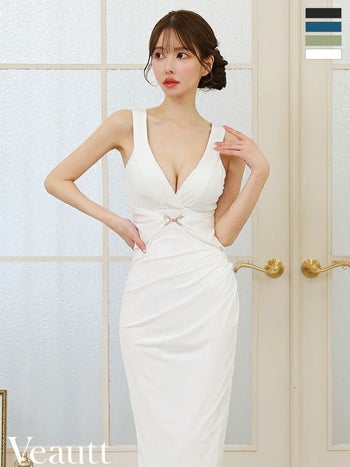 キャバドレス Veautt ヴュート Vネック セクシー ノースリーブ ウエストタック ジップデザイン スリット 膝丈ドレス