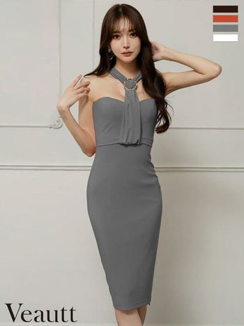 キャバドレス Veautt ヴュート エレガント ホルターネック リング ジップデザイン ワンカラー 膝丈ドレス