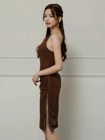 4. 【Veautt/ヴュート】ビジューチェーン シンプル ホルターネック ジップデザイン フロントシアー 膝丈ドレス(VT082526)