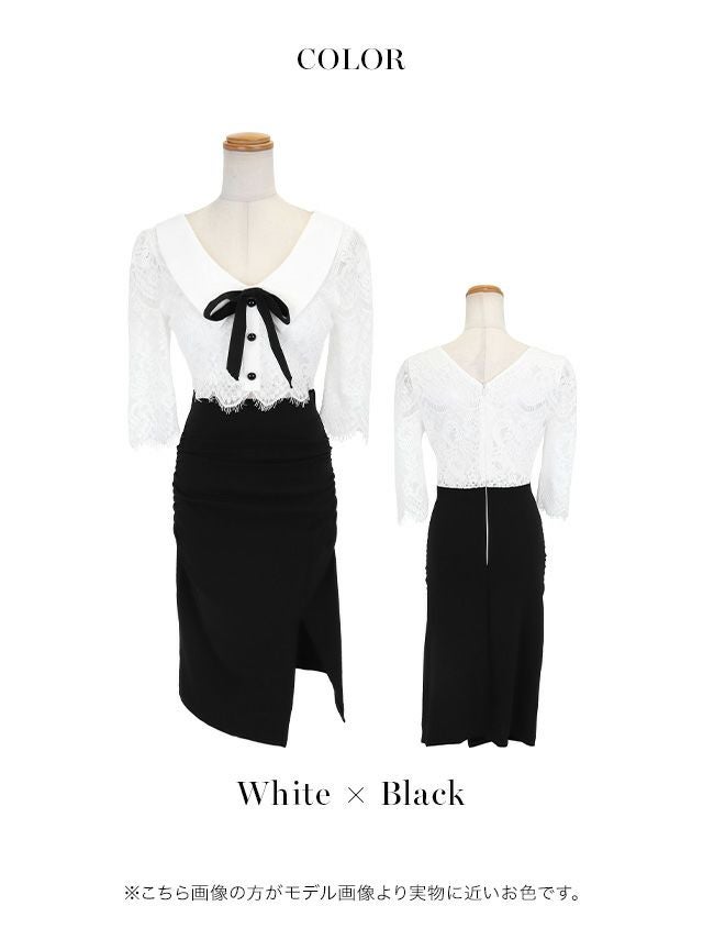 他の画像を見る Lあり!大人フェミニンなデザイン♪ 【Anella/アネラ】袖あり スカラップレース リボン 襟付き スリット タイト 膝丈ドレス 即日発送 ¥ 15,400 税込 詳細を見る お気に入りに登録する
