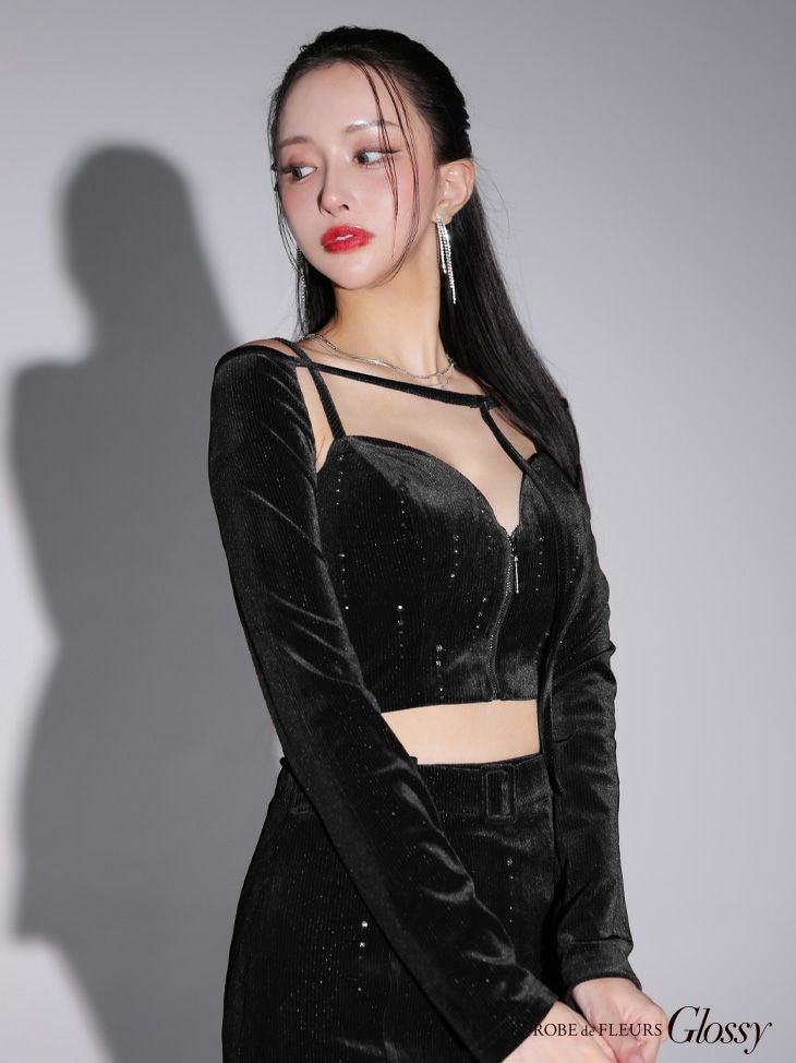 他の画像を見る XSあり!キャミドレスとして着用可能☆ 【Glossy by ROBE de FLEURS/グロッシー】オープンバスト 長袖 キャミソール ラメ ベロア ジップデザイン セットアップ セクシー タイトミニドレス (GL3743) ¥ 31,680 税込 詳細を見る お気に入りに登録する